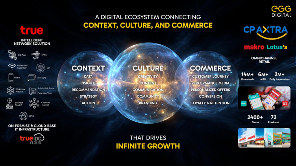เอ้ก ดิจิทัลจึงร่วมกับ True Corporation และ CP AXTRA จัดงาน ‘EGG Digital Nexus: The Fusion Frontier’ เพื่อตอกย้ำพันธกิจที่มุ่งนำ AI และอินไซท์เชิงลึกมายกระดับอุตสาหกรรมไทยให้เติบโต ตามแนวคิด EGG Digital Infinity Loop of Growth เชื่อมต่อทุกจุดสัมผัสของธุรกิจและผู้บริโภคเข้ากับข้อมูลด้วยหลัก 5Cs (Connect, Create, Communicate, Convert, Curate) เพื่อสร้าง One Single View ที่นำไปสู่การสร้างประสบการณ์ Hyper-Personalized พร้อมสร้างคลื่นลูกใหม่ในการเติบโต (New Wave of Growth) ที่ไร้ขีดจำกัด”