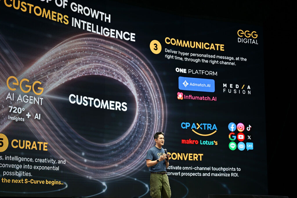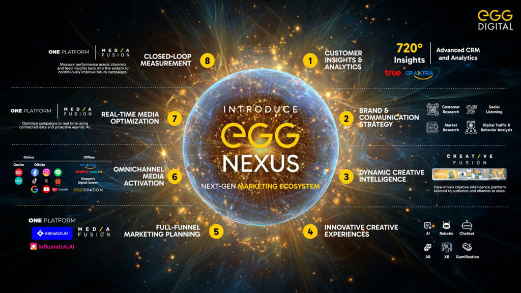 ดร. ธีรเดช ดำรงค์พลาสิทธิ์ ประธานเจ้าหน้าที่บริหาร บริษัท เอ้ก ดิจิทัล จำกัด กล่าวว่า “ปัจจุบัน AI ไม่ได้เป็นเพียงแค่เครื่องมือ แต่เป็นเครื่องยนต์ที่ช่วยขับเคลื่อนเศรษฐกิจและธุรกิจให้ก้าวไปข้างหน้า โดย AI จะเข้ามาเปลี่ยน 3 ด้านสำคัญ ได้แก่ พลิกโลกเศรษฐกิจจากศูนย์กลางเดียวสู่ระบบหลายขั้ว (Fragmentation), พลิกโฉมองค์กรสู่ระบบอัตโนมัติที่สามารถคิดและตัดสินใจได้เอง รวมถึงพลิกโฉมพฤติกรรมผู้บริโภคสู่ความต้องการประสบการณ์เฉพาะบุคคลสูงสุด ซึ่งความท้าทายสำคัญจึงอยู่ที่การผสาน AI เข้ากับข้อมูลมหาศาลจากทุกมิติและนำมาบูรณาการอย่างมีประสิทธิภาพ เพื่อสร้างการเติบโตที่ยั่งยืนผ่านระบบนิเวศการตลาดยุคใหม่ ‘EGG Nexus’ ที่เชื่อมโยงข้อมูลลูกค้า 720 องศา จากทุกแพลตฟอร์ม ตั้งแต่การวิเคราะห์อินไซท์ลูกค้า วางกลยุทธ์แบรนด์ วางแผนและลงสื่อแบบครบวงจร ไปจนถึงการวัดผลแบบเรียลไทม์ เพื่อขับเคลื่อนการตลาดด้วย AI อย่างเต็มรูปแบบ
